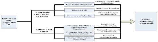 Environmental regulations affect the costs and benefits as well as the supply and demand of green technology innovation. Reconfiguring the resources that enterprises use to invest in green technology innovation activities ultimately affects the timing, scale and degree of the green technology innovation. The effects of environmental regulations on the green technology innovation of enterprises include the “innovation compensation effect” and the “compliance cost effect”, as shown in Figure 1.