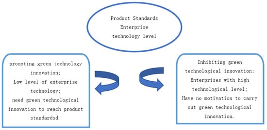 We use product standards as an example. As shown in Figure 2, these standards can stimulate and inhibit the green technology innovation of enterprises. First, product standards are specific provisions made for the environmental protection requirements of consumer products. If the technical level of products is lower than that called for in the product standards, enterprises are compelled to carry out technological innovation activities to meet these standards. In this case, product standards can promote the green technological innovation activities of enterprises to a certain extent. However, product standards also somewhat inhibit green technology innovation. If the technical level of an enterprise already allows it to meet product standards and if these standards are not further raised, the enterprise has no motivation to implement further green technology innovation.