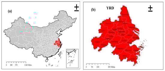 Study area. Note: (a) represents the position of the Yangtze River Delta urban agglomeration in China; (b) represents the Yangtze River Delta urban agglomeration.