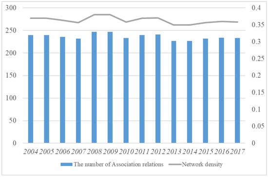 As shown in Figure 4, the total number of spatial correlation relationships of energy consumption in the YRDUA fluctuated between 227 and 247 from 2004 to 2017, and the average value was 236. The overall network density fluctuates between 0.35 and 0.38, and the average value is 0.363. This shows that during the sample investigation period, the correlation of 26 cities in the YRDUA shows a certain spatial correlation, but from the numerical point of view, the maximum number of relationships among 26 cities is 650 (25*26), while the number of relationships identified by the gravity model used in this paper varies by approximately 236. Hence, the YRDUA needs to strengthen the spatial correlation and stability of energy consumption.