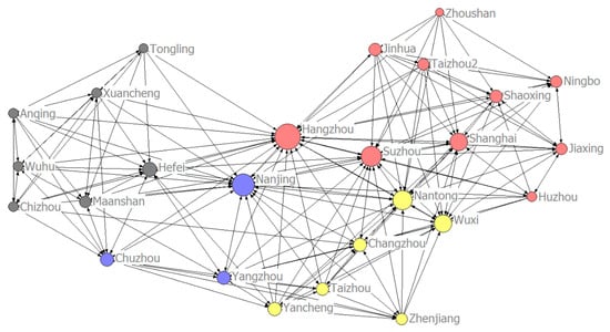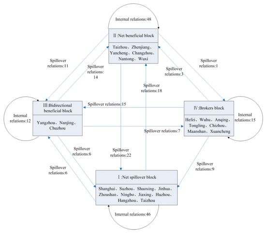 Based on the above analysis, the relationship diagram of the four blocks is constructed, as shown in Figure 6. The first block is the net overflow block, including Shanghai, Shaoxing, Jinhua, Zhoushan, Suzhou, Ningbo, Jiaxing, Huzhou, Taizhou and Hangzhou. The second sector, that is, the net benefit block, includes Wuxi, Zhenjiang, Taizhou, Nantong, Changzhou and Yancheng. The third block, the two-way overflow block, consists of Nanjing, Yangzhou and Chuzhou. Finally, the fourth block is the broker block, which includes Hefei, Tongling, Ma’anshan, Anqing, Chizhou, Xuancheng and Wuhu.