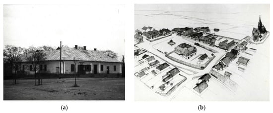 Southesast view of the town hall in Ciężkowice, 1947. Photograph by J. Dutkiewicz (a). Axonometric drawing of the core of the town by H. Kamiński as seen in 1965 (b). Source: own study based on [87].