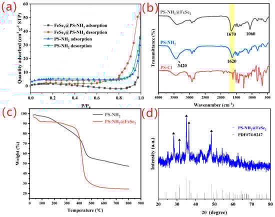 (a) Nitrogen adsorption–desorption isotherms. (b) FT-IR spectra of PS-Cl, PS-NH2 and PS-NH2@FeSe2. (c) TG analysis curve patterns of PS-NH2 and PS-NH2@FeSe2. (d) XRD patterns of PS-NH2@FeSe2.
