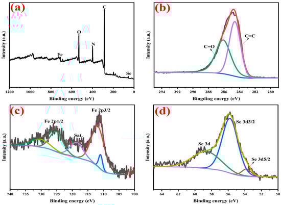 XPS survey spectra of PS-NH2@FeSe2 (a), high resolution of C 1s (b), Fe 2p (c) and Se 3d (d) spectra of as-prepared PS-NH2@FeSe2.