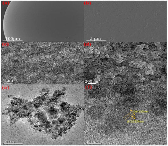 Scanning electron microscopy (SEM) is used to study the morphological characteristics and surface structure of the material required for the preparation of the catalyst. Figure 3a,b shows the micrographs of the catalyst carrier PS-NH2. Externally, PS-NH2 has a smooth surface, uniform texture, and no defect. Such a structure ensures uniform and continuous pore size distribution. The introduced -NH2 is uniformly distributed on the surface of resin spheres without agglomeration, ensuring the uniform adsorption of metal ions on the outer surface of the resin. Figure 3c,d shows the micrographs of the in situ growth of FeSe2 on PS-NH2 resin spheres. The comparison of the photos of unloaded PS-NH2 reveals that the introduction of FeSe2 significantly changes the surface morphology of PS-NH2. SEM images show that FeSe2 is stacked on the surface of PS-NH2, making the accumulated sites exhibit a multidimensional three-dimensional spatial structure generated by the stacked aggregation of FeSe2. This multilayer mesh structure is beneficial to increase the reaction area of the catalyst and the electron transfer efficiency during the reaction. Furthermore, the FeSe2 loading is uniform and almost loaded on the complete resin spherical surface. The specific surface area and volume of the PS-NH2 resin spheres are fully expanded. Transmission electron microscopy (TEM) shows that FeSe2 particles are relatively uniformly distributed (Figure 3e,f). The amount of stacking formed by FeSe2 loaded at each position is different, resulting in a multiangle three-dimensional mesh-like irregular configuration. Forming increased defects and edge structures and accelerating the transfer between electrons and holes are favorable. As shown in Figure 3e,f, the particle size of FeSe2 particles is about 5–10 nm with evident lattice stripes [,]. As shown in Figure S1, the elemental map corresponding to the PS-NH2@FeSe2 catalyst is analyzed and reveals that C, N, Cl, Fe, and Se elements appear simultaneously with dominant C and N. Overall, FeSe2 is successfully loaded onto the surface of PS-NH2 resin spheres, and the synthesized products can achieve the expected results.