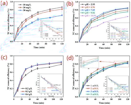 The effects of different doses of PS-NH2@FeSe2 catalyst on the degradation effect and rate (K) of TC are investigated under the conditions of constant influencing factors, such as potassium persulfate, TC concentration, and temperature. As shown in Figure 4c, the degradation effect and rate K on TC increase with increasing catalyst amount. When the dosage of PS-NH2@FeSe2 catalyst added increases from 20 mg to 30 mg, the removal rate increases from approximately 80% to 83%, and the rate constant K also increases from 0.01986 min−1 to 0.02215 min−1. When 40 mg catalyst is added, the removal rate increases to 85%, and the rate constant K changes to 0.02352 min−1. This result indicates that a high amount of catalyst provides increased active catalytic sites. The rate of degradation of TC molecules is accelerated by generating more radicals []. By analyzing the effect of the dose difference of the added catalyst on the removal rate and the floating change of the degradation rate (K) and considering the cost-effectiveness of its amount of potassium persulfate, the 20 mg catalyst is chosen as the most reasonable experimental parameter.