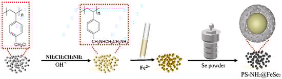 The resulting product PS-NH2 was placed in aqueous FeCl3 solution with a certain concentration and stirred at room temperature to allow the PS-NH2 resin spheres to fully adsorb Fe3+, thus obtaining the resin after chelation with metal ions. Subsequently, the obtained product was freeze-dried at −40 °C and transferred to a hydrothermal kettle. Then, 0.2 g of selenium powder with 30 mL of ethanolamine solvent was added to the hydrothermal kettle under 160 °C for 12 h to obtain the target product, which was named PS-NH2@FeSe2.