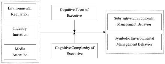 To further understand the heterogeneity of EMB, it is critical to consider the micro-institutional pressures. Executive cognition is an essential factor in the micro-institutional domain of firms [14]. Due to differences in background, experience, knowledge, and preferences, macro-institutional pressures are filtered and interpreted through the framework of executive cognitive, leading to firms’ heterogeneous behavior [31,46]. Executive cognition includes two dimensions: cognitive focus of executive and cognitive complexity of executive [30]. Cognitive focus dominates executives’ interpretation of environmental information through a few key concepts, while cognitive complexity disperses executives’ thinking through diverse concepts and inter-concept relationships [31,47,48].