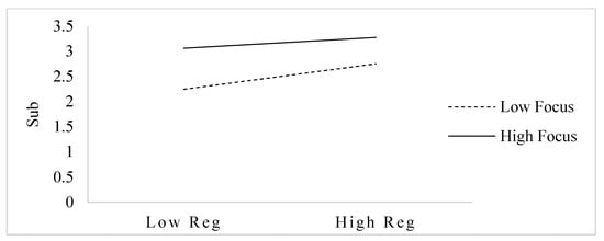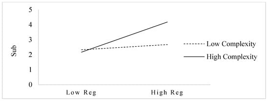 Models 7 and model 8 in Table 5 test the moderating role of executive cognition in the relationship between environmental regulation and substantive EMB. The coefficient of interaction term (Reg × Focus) in model 7 is significantly negative (β = −0.147, p < 0.05), indicating that cognitive focus of executive has a moderating effect on environmental regulation and substantive EMB. In order to visualize the moderating effect, the figure is further drawn. Figure 2 shows that when cognitive focus of executive is low, environmental regulation can promote substantive EMB. However, when cognitive focus of executive increases, the promoting effect of environmental regulation on substantive EMB is weakened. It can be inferred that cognitive focus of executive plays a negative moderating role in the relationship between environmental regulation and substantive EMB, that is, Hypothesis 4a holds. The coefficient of interaction term (Reg × Complexity) in model 8 is significantly positive (β = 0.831, p < 0.05), indicating that cognitive complexity of executive has a moderating effect in the relationship between environmental regulation and substantive EMB. It is further shown by Figure 3 that the slope of the positive effect of environmental regulation on substantive EMB is greater when cognitive complexity of executive is higher, indicating that cognitive complexity of executive plays a positive moderating role in the relationship between environmental regulation and substantive EMB, that is, Hypothesis 5a holds.