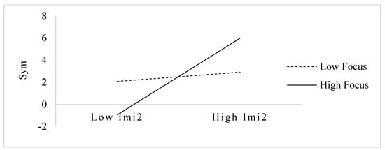 Model 9 and model 10 examine the moderating effect of executive cognition in industry imitation and symbolic EMB. The coefficient of interaction term (Imi2 × Focus) in model 9 is insignificant (β = −2.515). Hypothesis 4b is not supported, that is, cognitive focus of executive fails to play a negative moderating role in the relationship between industry imitation and symbolic EMB. The coefficient of interaction term (Imi2 × Complexity) in model 10 is significantly positive (β = 3.043, p < 0.01), indicating a moderating effect of cognitive complexity of executive in industry imitation and symbolic EMB. As shown by Figure 4, the promoting effect of industry imitation on symbolic EMB is stronger when cognitive complexity of executive is higher, indicating that cognitive complexity of executive plays a positive moderating role in the relationship between industry imitation and symbolic EMB, that is, Hypothesis 5b holds.