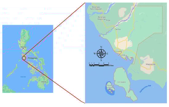 The municipality of San Jose is a coastal municipality in the province of Occidental Mindoro, in which the municipal center is located at 12°21′ N, 121°4′ E with an average natural grade line (ground) elevation of 7.8 m above mean sea level. The municipality has a total land area of 446.70 km2, which is 7.63% of the total area of the province of Occidental Mindoro [21]. Geographically, San Jose is 173 km from the municipality of Mamburao, the capital city of the province. The municipalities of Rizal and Calintaan, Mansalay, Bulalacao, Magsaysay, and the Mindoro Strait form the northern, eastern, southern, and western borders of San Jose, respectively [22]. The map of the study area is presented as Figure 1.