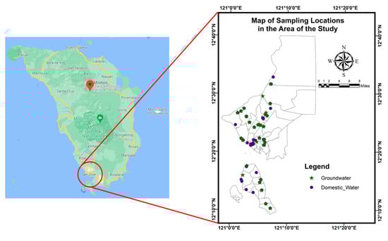 A total of 104 water samples (71 DW and 33 GW samples) were collected randomly in different barangays of the municipality of San Jose, Occidental Mindoro. The 104 grab samples were gathered using stainless steel samplers and stored in prepared acid-rinsed one liter polyethylene (PE) bottles. This is to remove the possible contaminants in the PE bottles. The PE bottles were all properly labeled, sealed, and placed temporarily in coolers. The collection, preparation, and storage of the DW and GW samples were in accordance with the EPA No. SESDPROC-301-R3 [26]. The coordinates of every sampling site were recorded utilizing a Garmin Montana 680 GPS. The sampling locations for the DW and GW are presented in Figure 2. The coordinates and corresponding elevations of the sampling locations are enumerated in Appendix B.