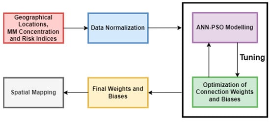 Utilizing the MMs concentrations detected from the water samples and their corresponding PI and MPI, spatial maps were generated by employing the MLGI method that utilized the NN-PSO algorithm and integrating it to an EBK interpolation technique. The MLGI method is the integration of a hybrid artificial neural network (ANN)–particle swarm optimization (PSO) model to the empirical Bayesian kriging method to map the MMs’ concentration and pollution indices. The connection weights of the neural network models for the concentrations and pollution indices were optimized using the PSO approach, utilizing MATLAB2021a. The Levenberg-Marquardt algorithm was utilized in the algorithm training for ANN-PSO models, since it is the fastest method for moderately sized networks [38], such as used in this study. The transfer function employed was the hyperbolic tangent sigmoid function [50]. The number of iterations for the model development was 2000 iterations [51]. Figure 3 presents the chart of the process for the MLGI approach employed in this study.