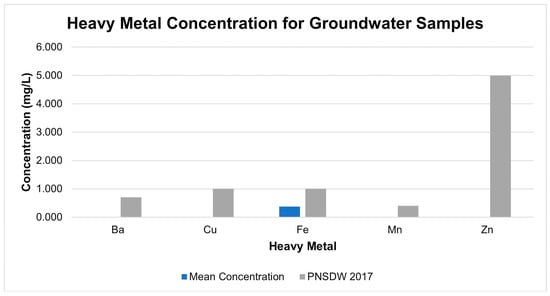 The mean concentrations for GW samples were compared to the PNSDW 2017, as shown in Figure 5. All mean concentrations of the GW samples were below the threshold values set by the PNSDW 2017. Among the MMs detected in the GW samples, only the Fe concentration was recorded above the PNSDW 2017 standard values in various sampling locations.