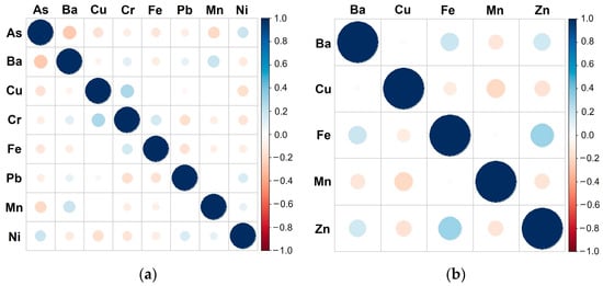 The MMs concentrations correlations of water samples were analyzed using a multivariate Pearson correlation matrix. In order to demonstrate the correlation concerning the investigated parameters, particularly with regard to their sources, Pearson’s correlation analysis was performed on the data using MATLAB R2021a and R Studio software [52]. Parameters with a correlation coefficient of 0.90 ≤ R ≤ 1.00 indicate a very strong correlation; 0.70 ≤ R ≤ 0.89 suggests a strong correlation; 0.40 ≤ R ≤ 0.69 denotes a moderate correlation; 0.10 ≤ R ≤ 0.39 signifies a weak correlation; and 0.00 ≤ R ≤ 0.09 indicates a negligible correlation [53]. Additionally, pairings with strong and moderate coefficients suggest considerable risk factors, whereas those with weak coefficients suggest low risk factors [54].