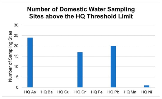 The summary of the number of sampling locations exceeding the HQ threshold limit is presented in Figure 8. About 33.8% of DW sampling sites had the HQ value of As above the threshold, while that of Cr, Pb, and Ni were 23.9%, 28.2%, and 1.4%, respectively. No sampling point recorded an HQ value above the threshold value for GW sampling sites.