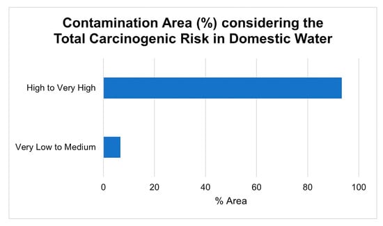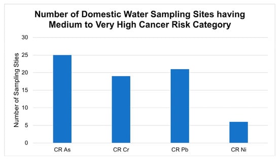 Considering the ELCR values, the summary of the number of sampling sites categorized to have medium to very high cancer risk is shown in Figure 9. About 35.2% of the sampling sites for DW had CR categorized as “medium to very high cancer risk”. Additionally, Cr, Pb, and Ni were 26.8%, 29.6%, and 8.5%, respectively, and categorized as “medium to very high cancer risk”.