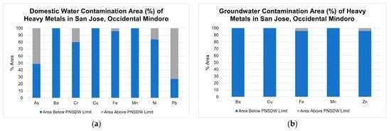 The mean HQ values in GW samples for Ba, Cu, Fe, Mn, and Zn were below 1. Moreover, the mean HI value was also less than 1. This means that there was non-carcinogenic risk for Ba, Cu, Fe, Mn, and Zn in GW. The highest mean HQ observed was for Fe, but the calculated value was still below 1. The trend of the mean HQ values in GW samples was Fe > Mn > Ba > Zn > Cu. The concentration of Fe contributes to the 85% of the mean HQ value. The contribution of each MM to the HQ is shown in Figure 7a,b. It was observed that HQ for As was the significant contributor to the total HI value.