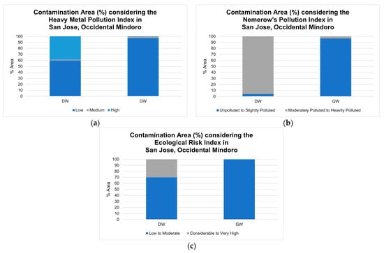 Using the MMs’ concentrations detected in the water samples, the MPI, NPI, and ERI were calculated. The mean MPI value calculated in DW samples was 90 times greater than the upper limit of the “low” pollution MPI category, while the sampling point observed with the highest MPI value was 701 times larger. Considering the GW, the mean MPI value was below the upper boundary of the “low” pollution category. The mean NPI values for DW revealed that the average calculated NPI values were 135 times greater than the upper threshold for the unpolluted location criterion. Moreover, the highest NPI calculated was 1080 times the unpolluted threshold limit. On the other hand, the GW mean NPI values were within the unpolluted category. The mean ERI value calculated for DW was 3.5 times the upper limit of the “low” ERI category, while that of the highest ERI observed was 23.8 times larger. For the GW samples, the mean ERI value calculated was within the “low” ERI category.