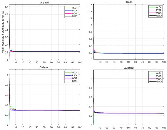 The search process for four intelligent optimization algorithms on four regions (Jiangsu, Henan, Sichuan, and Guizhou) is shown in Figure 2.
