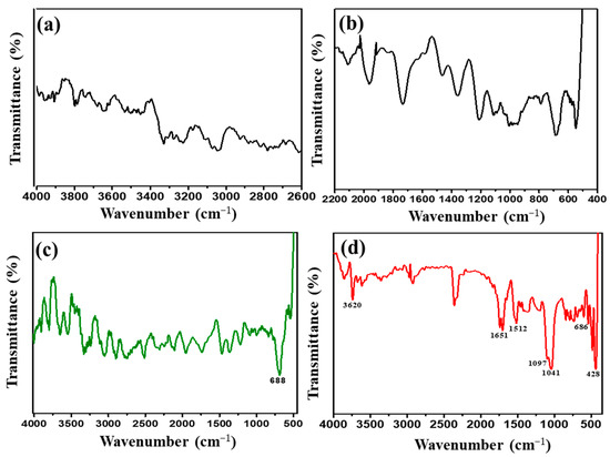 The NbCl5-impregnated solid acid catalyst loading over the surface of perlite was examined by FT-IR studies. The FT-IR spectra of pure perlite, NbCl5 and NbCl5/perlite are shown in Figure 1. FT-IR spectra of pure perlite and NbCl5/perlite show absorption bands between 1030 and 1100 cm−1, which were assigned to Si–O stretching vibrations of the O–Si–O group. Furthermore, an O–Si–O bending vibration was observed between 400 and 500 cm−1. The stretching and bending modes of the OH groups on the surface of perlite (mainly Si–OH groups and surface-adsorbed water molecules) were depicted between 3500–3630 cm−1 and 1510–1630 cm−1, respectively. When comparing the spectrum of NbCl5 (Figure 1c) with NbCl5/perlite, the additional band at 686 cm−1 in NbCl5/perlite (Figure 1d) corresponds to Nb compound [31].