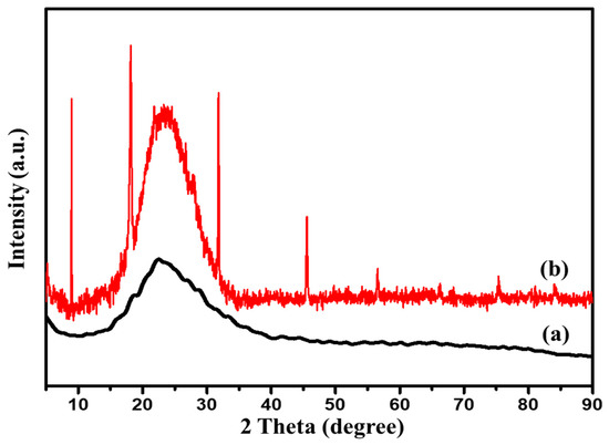 In order to investigate the crystalline nature of the modified perlite, the X-ray diffraction pattern of NbCl5/perlite is given Figure 2b, along with pure perlite (Figure 2a) for comparison. The broad peak at the 2θ value of 26° indicated the amorphous nature of perlite (Figure 2). The XRD pattern of NbCl5/perlite (Figure 2b) is almost comparable with pure perlite, and the additional peaks at the 2θ values of 8.9°, 18.1°, 31.7°, 45.5° and 56.5° that are attributed to Nb [32,33] (partial oxidation of NbCl5 into its oxides form) reveal the successful immobilization of NbCl5 onto the perlite surface.