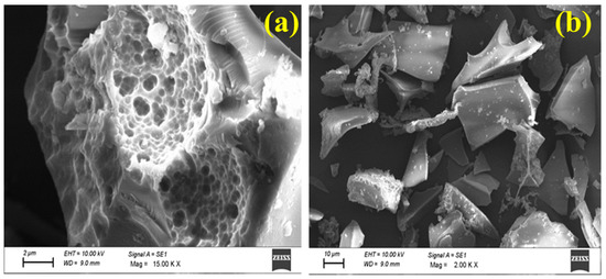 SEM images of NbCl5/perlite 2 μm (a) and 10 µm (b).