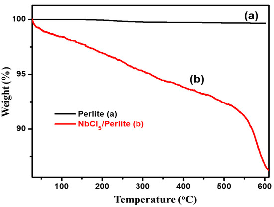 The thermal stability of the catalyst was examined by the Thermogravimetric analysis (TGA). The TGA of perlite and NbCl5/perlite are shown in Figure 4a,b, respectively. For bare perlite, there was no significant mass loss observed until 600 °C, with the initial mass loss observed (about 0.28%) corresponding to the removal of adsorbed water molecules. From Figure 4b, an initial steady mass loss of 3.1% until 200 °C corresponded to the removal of water molecules; then, from 200–550 °C, there is a gradual loss of approximately 6% NbCl5 from the solid surface, followed by a reliable mass loss of 6.4% from 550–590 °C, which is owing to the rapid removal of NbCl5 [32]. An additional mass loss above 590 °C might be a result of the dehydroxylation of perlite, as anticipated (Figure S18) [33]. However, NbCl5/perlite was synthesized at 250 °C, and no significant loss of NbCl5 occurred. In addition, the partial oxidation of NbCl5 was evidenced by XRD measurements. The surface analysis of the prepared catalyst was studied using BET analysis. Surface area, pore volume and diameter were analyzed from BET results and were found to be significantly lower than pure perlite, possibly due to the loading of NbCl5 over perlite (Table 2).