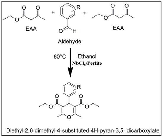 Pyrans establish an important class of ring oxygen containing heterocycles, and they are important biologically active compounds with good antibacterial, antitumor and antibiotic effects [24,25]. The viability of the NbCl5/perlite catalyst was studied by preparing 4-substituted pyrans from EAA (Ethyl acetoacetate) and aromatic aldehydes in its presence (Scheme 1).