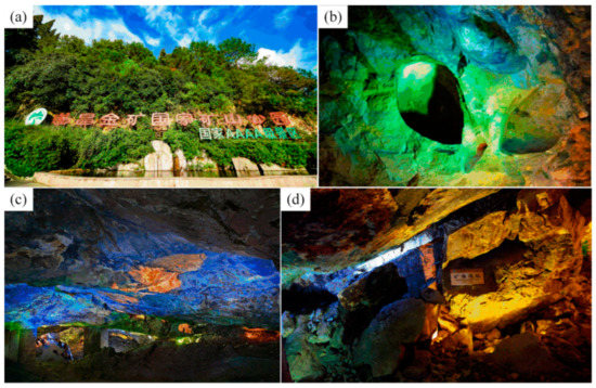 Construction of green mine at SuiChang gold mine: (a) exterior view of SuiChang National Mine Park; (b) the gold grottoes of the Dang Dynasty; (c) the gold grottoes of the Song Dynasty; (d) mining disaster size from the Ming Dynasty [29]. (cc by-sa 4.0).