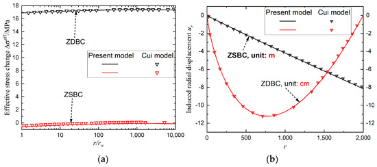 Profiles of (a) effective horizontal stress change and (b) induced radial displacement during pure CO2 injection between the present model and results by Cui et al. [15]. ZDBC and ZSBC denote zero displacement and zero stress change at the outer boundary, respectively.