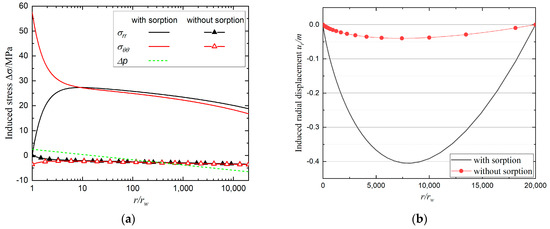 (a) The induced stress and (b) radial displacement difference with normalized radial distance considering sorption or not. In this case, pure CO2 is injected by 12 MPa with reservoir pressure before injection 3 MPa and ZDBC condition is imposed.