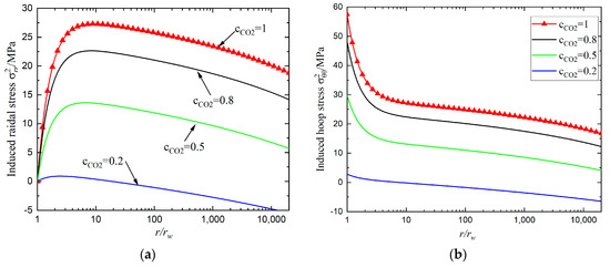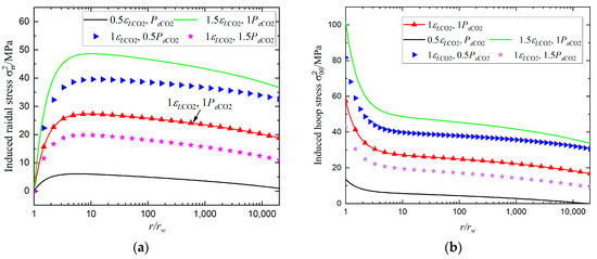 In contrast to conventional reservoirs, sorption-induced swelling results in a large shift in the reservoir’s stress, excluding the poroelastic effect. Figure 2 displays the variations between induced stress and radial displacement whether sorption is considered or not, emphasizing the significance of doing so. It should be noted that the steady reservoir pressure distribution results in negative (tensile) radial and hoop stresses, when only the poroelastic effect is considered, while compressive radial and hoop stresses are induced, including the sorption effect as shown in Figure 2a. The swelling/volumetric strains induced by the sorption of CO2 and CH4 are different, and then the displacement of CH4 by CO2 causes tremendous net swelling. However, the zero displacement at the outer boundary condition overwhelmingly restricts the coal to accommodate the net swelling. In contrast, the induced displacement, considering the sorption effect, is one order more than that merely considering the poroelastic effect in Figure 2b. Thus, considering the strong swelling and boundary condition, the stress state in the whole domain is markedly elevated in Figure 2a. Furthermore, the maximum radial and hoop stresses occur at the borehole; thus, reservoir instability can be analyzed using the wellbore stability issue. Additionally, the incremental reservoir pressure distribution in Equation (6), rather than the real reservoir pressure distribution, causes the stresses change.