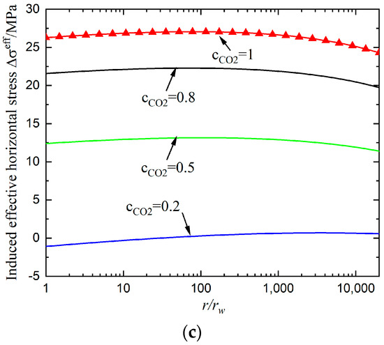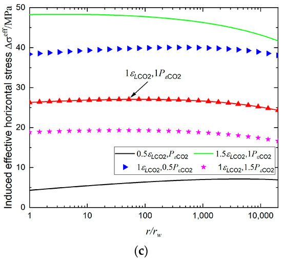 Profiles of (a) induced radial stress, (b) hoop stress and (c) effective horizontal stress distribution with varying adsorption parameters. In this case, pure CO2 is injected by 12 MPa with 3 MPa and ZDBC condition is imposed.