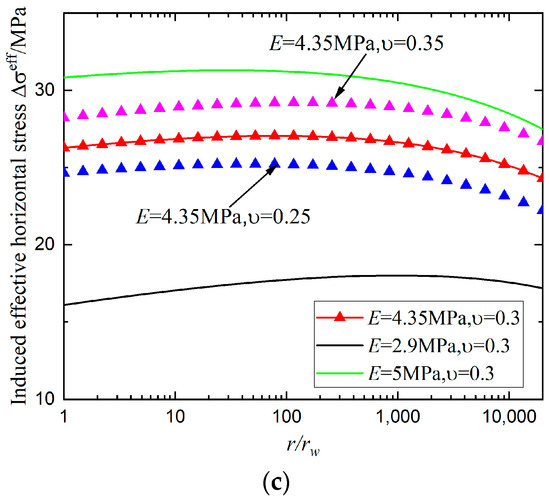 Profiles of induced (a) radial stress, (b) hoop stress and (c) effective horizontal stress distribution with varying Young modulus and Poisson ratio. In this case, pure CO2 is injected by 12 MPa with 3 MPa and ZDBC condition is imposed.