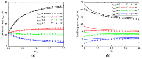 Profiles of (a) total radial stress and (b) total hoop stress with radius with along 0° and 90° direction. In this case, mixture gas is injected by 12 MPa with 3 MPa and ZDBC condition is imposed.