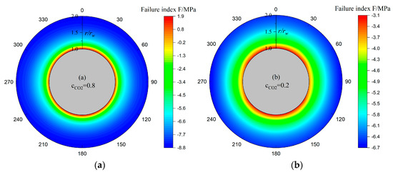 Next, failure index around the borehole in Equation (23) with various gas components of CO2 is presented in Figure 7. Given the large gas component of CO2 (), wellbore failure due to significant sorption-induced stress (seen in Figure 6) emerges at the borehole wall. The maximum and minimum principal stresses at the borehole wall in this case are the hoop and radial stresses (i.e.,), respectively. Furthermore, since the magnitude of isotropic stress induced by sorption is substantially greater than that of initial in-situ stress, the failure index distribution exhibits negligible anisotropy. Additionally, when , the failure index around the wellbore lies in the range of −3.1~−6.7 MPa, indicating a stable wellbore state under the given conditions. Additionally, the highest failure index is located at the borehole wall in a 0° direction. In contrast, when drops further (), wellbore failure occurs at the borehole wall in the 90° direction. In this instance, a large proportion of weakly adsorptive N2 induces the smallest hoop stress at the borehole in a 90° direction, as shown in Figure 6b, which is the minimum principal stress (i.e., ). So the wellbore failure index first declines and then climbs as goes from 1 to 0.1. Then, we may deduce that for the provided parameters in this situation, the gas component of CO2 must fall within a rational scope in order to preserve wellbore stability.