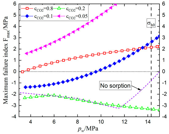 Figure 8 depicts the evolution of the maximum failure index with borehole pressure under the varying gas components of CO2 to investigate wellbore stability in the mixture gas injection. It should be mentioned that the maximum borehole pressure is constrained to the initial minimum horizontal stress to prevent the reservoir from hydraulic fracturing. In the absence of sorption, as borehole pressure rises, the maximum failure index first sightly decreases and subsequently increases, as illustrated by the violet dashed line in Figure 8. The increase in pore pressure causes effective horizontal and vertical stresses to decline, which leads Mohr’s circle of stress to continuously shift to the left and approach the failure envelope, leading to an increase in wellbore failure index. In addition, the evolution of the maximum failure index is irrelevant with gas component , when just the poroelastic effect is taken into account.