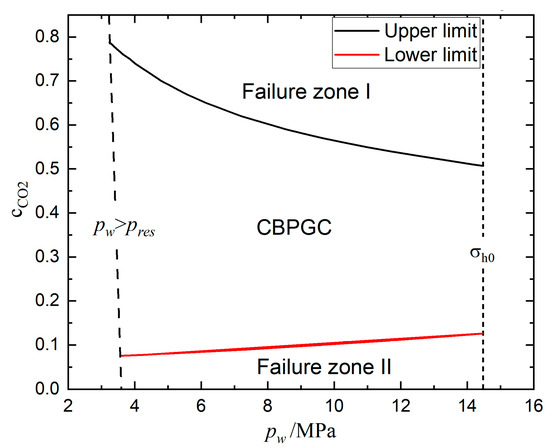 CBPGC with pore pressure before injection 3 MPa. The critical in the CBPGC is confined by and , and the upper and lower limit of in the CBPGC is obtained by wellbore failure index .