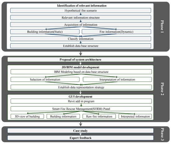 The research methodology in this study consists of three main phases as depicted in Figure 1. In Phase 1, the fire-response information has been extensively collected and categorized. Using the classified information structure, the system has been developed in Phase 2. The final stage of validation has been conducted using a real-case study in Phase 3. The details are as follows.