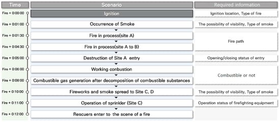 A hypothetical scenario has been prepared based on fire manuals and previous studies. This process allows the authors to figure out how the required information changes in case of a building fire. After a fire breaks out, smoke is generated over time, and the fire flame grows in various directions inside the building. As a result, building conditions change over time, such as blocked entrances and toxic gas generation. Due to such changes, accurate information is needed for emergency response and rescue. Hence, it is necessary to capture crucial information such as combustion type, combustible gas, optimum fire rescue and escape, openings, building damages, and extinguishing equipment.