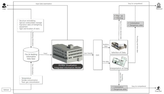 Although various studies are being conducted to develop new fire information management, the existing studies have several limitations. First, there is a lack of integration of building information in fire rescue management systems. Since the current fire disaster management is being provided without the facilities' information, it is difficult to simultaneously integrate the fire and building data into the system. This causes a time lag in recognizing prompt and accurate information in the circumstances of a building fire. Second, the BIM-based fire disaster management system fails to interpret the captured raw data, which prevents the fire rescuers from using the system practically. Although the purpose of the information is to support prompt rescue or evacuation activities, the current system has limitations for system users to monitor the effect of the data on entry, exit, and rescue activities.