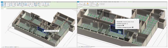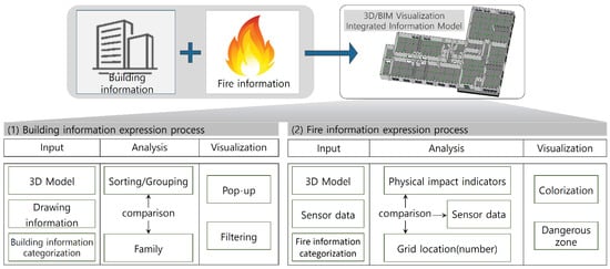 An efficient information management approach has been set up, as shown in Figure 4, to successfully integrate the database structure into the system. When dealing with building-related (static) data, the input layer relates to the 3D model, the specifics of the drawings, and the relative information categorization collected by an information-gathering system. Based on the input data, a collection of 3D model elements is compared, arranged, and categorized in accordance with their structure, material, and location inside a building. Through “pop-up” and “filtering” features, the information may then be visualized. The data obtained from the 3D model and sensors coincide with the input layer when it comes to fire (dynamic) information. Then, the sensor data is compared with the physical impact indicators and grid locations, which are then matched in the 3D model. The final information can be visualized and provided in a color-coded format. Two different types of information expression processes are listed below.