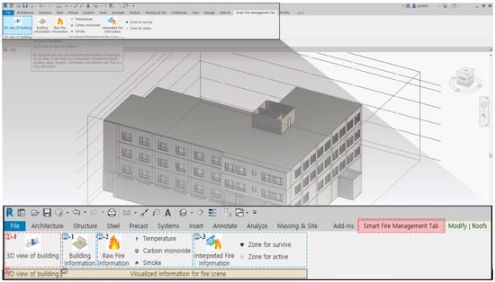 Using Revit™ software, the case study project has been digitalized into a 3D/BIM model. The SFRM system is embedded into the digital model as presented in Figure 8. As seen in Figure 8, a menu bar is newly inserted into the Revit™ software in association with a GUI. This GUI consists of four buttons under two major functions: 3D view of the building and visualized information for the fire scene. The details are elaborated in the following subsections.