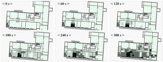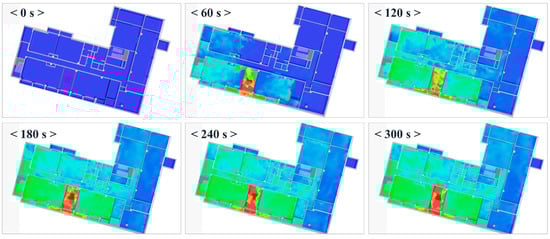 By clicking the “Raw Fire Information” button in the SFRM, the users can view the visualized information on the fire. This visual information can provide the users with the circumstances of a fire inside the facility. Thus, the users can effectively recognize the real-time situation of a fire. In the form of color gradation, the temperatures, toxic gases, and smoke are represented in the 3D/BIM model. The color blue initially represents the building, but after 60 s, the ignition point changes to red, indicating high temperature and smoke. As the fire spreads, the area around the ignition point changes to yellow and green, indicating that the temperature and smoke have decreased but the fire is still spreading. As time goes on (>120 s), the number of red, yellow, and green areas increases, indicating that the fire is spreading further. The system users can easily understand the ignition position of a fire and predict the diffusion of both the flame, toxic gas, and smoke as seen in Figure 11. The real-time information generated by clicking this button plays an important role in making a better decision in responding to the building fire.