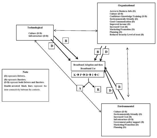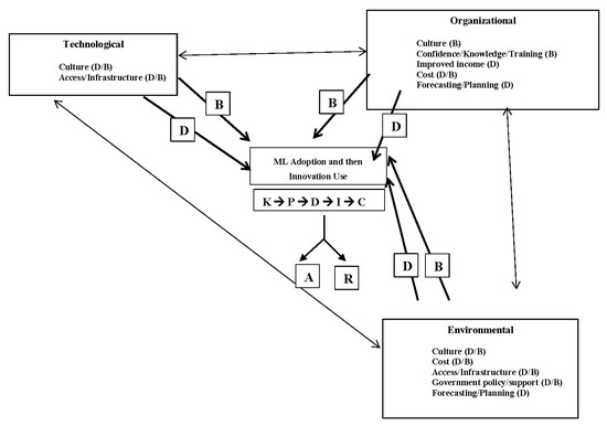 As shown in Figure 1, the drivers and barriers to broadband adoption/use are presented under the technological, organizational, and environmental contexts of the TOE. The words and lines in Figure 1 labeled with ‘D’ represent drivers; words and lines labeled with ‘B’ represent barriers; words labeled ‘D/B’ represent both drivers and barriers. Additionally, the single arrows in the lines labeled with ‘D’ and ‘B’ in Figure 1 represent, respectively, drivers leading to broadband adoption/use and barriers leading to non-broadband adoption/use; the inter-connectivity between the contexts of technology, organization, and environment are represented by the double-arrowed black lines. Knowledge is represented by ‘K’, persuasion is represented by ‘P’, decision is represented by ‘D’, implementation is represented by ‘I’, and confirmation is represented by ‘C’. Additionally, adoption is represented by ‘A’, and rejection is represented by ‘R’ [76]. However, for this research linked to the adoption of machine learning by family/non-family-owned farms based in rural UAE, the BAF has been slightly amended to the Innovation Adoption Framework (IAF), which is shown in Figure 2.