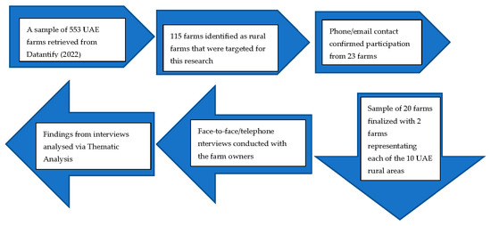Convenience sampling was implemented by accessing the [78] database to identify 553 farm businesses in the UAE. Then, 115 potential interviewees (rural farms) for this research were identified through the dimensions of rurality [76]. After initial contact via email/phone to confirm farm owners’ participation, a sample of 23 farms from the 10 rural areas were identified as willing participants for this research. However, to ensure better representativeness of the sample, the researchers opted for a final sample of 20 farms, whereas in this sample, 2 farms represented each of the 10 rural UAE regions. The 10 rural regions in the UAE as per the dimensions of [76] (Table 4) were identified as Al Ain, Al Bateen, Al Dhafra, Al Foah, Al Khazna, Al Madam, Al Qattara, Al Remah, Masafi, and Sweihan.