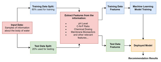 The meaning of the arrows, terms, and symbols in Figure 5 is the same as the explanations related to Figure 1. Based on the findings from Table 8, the authors propose two ML program solutions to address the issues highlighted by farm owners based in rural parts of the UAE. The first solution (Solution A) involves a Water Predictive Recommendation System, which provides recommendations on a water cleaning schedule, chemical dosing, and cleanliness recovery to ensure the availability of access to saline water. Recommendations will be carried out based on the relevant information regarding the bodies of water, such as the required and current pH level, C-N-P ratio, and many others. Another solution (Solution B) is the Farming Activity Suitability Assessment Tool based on weather forecasts. This requires input data that provide suitable weather conditions for certain farming activities, as well as the required moisture, temperature, and other considerations. Based on this and the weather forecast, it automatically advises users regarding the suitability of certain farming activities based on the weather. This will allow farmers to plan their schedule, paving the way for a smoother farming process. Figure 6 provides the ML template for Solution A.