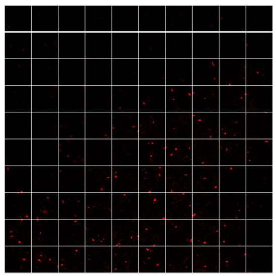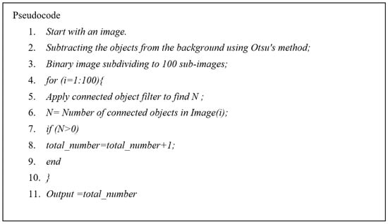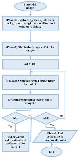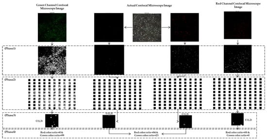The intelligent machine spatial distribution quantification filtered algorithm starts with subtracting the objects in the image from the background by replacing all values above a globally determined threshold with 1 s and setting the rest values to 0 s. The globally specified threshold is selected based on Otsu’s method. Otsu’s method chooses the threshold value using a 256-bin image histogram []. Next, the Binary image is subdivided into 100 sub-images. Subsequently, the process of every sub-image finds if there is any portion of the object or not. If there is any, it is counted to end after all the 100 sub-images are processed. This way, the maximum counter number is 100, which means it fully covers hundred percent. Finally, the algorithm’s output is the total number of sub-images with or even part of an object. The flow chart and Pseudo code are shown in Figure 7 and Figure 8. In order to clarify the algorithm and the difference in preprocessing of the three algorithms, the algorithm was applied to the three types of processed confocal images. In Figure 9, the red and green channel confocal microscope images are started directly to phase 1. In contrast, the actual confocal microscope image is preprocessed to filter out two images, pure red and pure green, then processed as in Figure 7. In addition, Figure 9 shows the four main processing phases applied to the three types of confocal images with the modification effect of every phase.