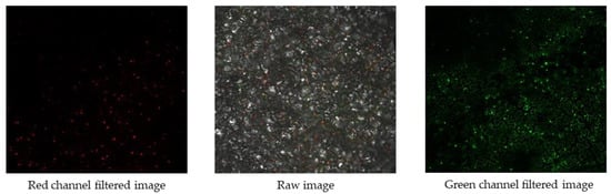 Lastly, the proposed algorithm provided a more effortless and faster methodology for quantifying and analyzing FCM images, showing high accuracy compared to the traditional analysis method. Further, this methodology does not require special sample preparations or extensive optimization of instrument settings. Apart from analyzing the spatial distribution of fluorescence in the samples, the proposed algorithm with fluorescence microscopy can also be used to analyze visible and sub-visible aggregates. The methodology offers significant advantages over other common approaches. Fluorescence sizing from 1 µm backward cannot be differentiated using a simple visual method due to the limitation of human vision, but it could be efficiently detected using the proposed method without any requirement of complex sample preparation steps. Moreover, unlike black backgrounds, when analyzing images with a grey background (actual image), it is not easy for human vision to differentiate the green or red colors from a grey background. The grey background in live FCM images may result in inaccurate quantification for particular samples. Fluorescence microscopy analysis prevents false detection of dust, air bubbles, and non-proteinaceous particles that could plague the study []. Overall, it can be concluded that the proposed algorithm can successfully denoise the fluorescence microscope images. The proposed methodology can be effectively used as a cheap, sustainable, and complementary technique to traditional approaches. However, the results of this work show a promising path to quantifying and analyzing FCM images sustainably and quickly. It is essential to use every effort in order to build sustainable biotechnology laboratories [,,]; the current results add to the knowledge of sustainable biotechnology by providing a methodology that saves time and labor in the laboratory.